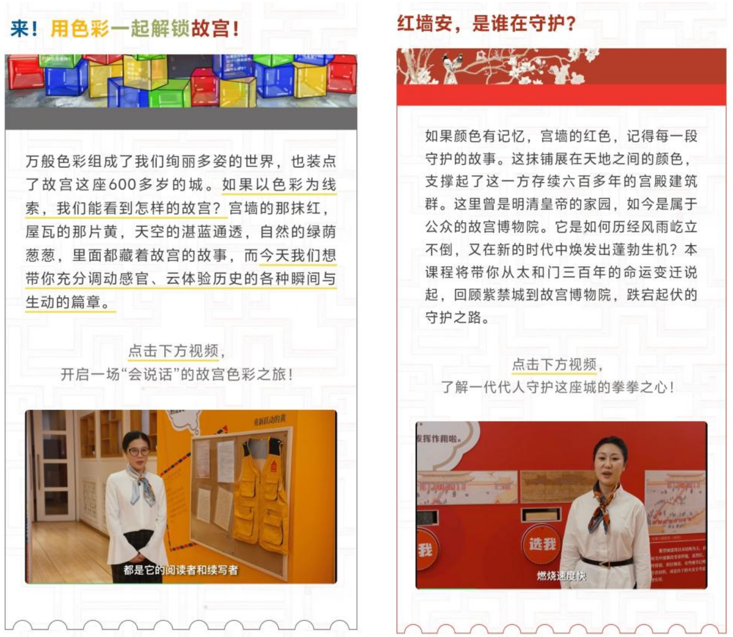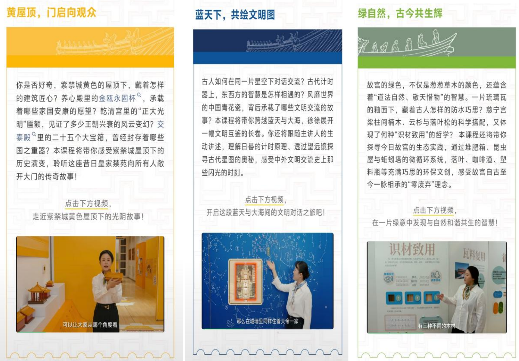 每期线上课程围绕一个色彩主题展开,通过清晰的线索和有趣的知识点,带领观众“云游”展厅——从红色单元中的守护精神、黄色单元中紫禁城到故宫博物院的开放历程,到蓝色单元中的文明交流互鉴,再到绿色单元中古人敬天惜物的智慧和今日故宫的生态实践。通过这些鲜明的色彩,线上课堂为广大观众提供了随时随地了解故宫的窗口,生动呈现了故宫色彩斑斓的全貌。