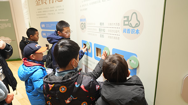 而这些有趣的互动体验也深度融入课堂设计之中。无论是线上还是线下,课程内容都与展览主题紧密相连。在大多数课堂上,展厅就是孩子们的教室。展览中丰富的文物图示、实物教具与互动展项,都成为了生动直观的教学素材。孩子们在展厅中或站或坐,自由触摸、观察、聆听,打破了传统课堂的边界,将学习过程变成了一场”没大没小“的观展体验。